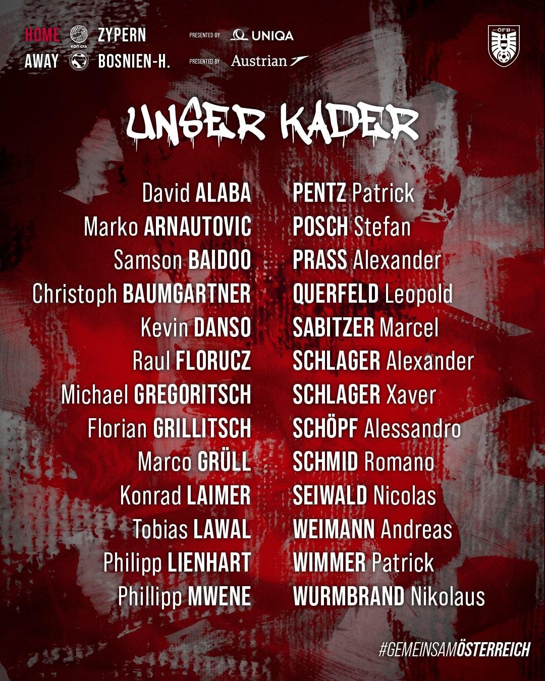 北京时间8月26日,奥地利国家队公布了9月国际比赛日的大名单,阿拉巴、阿瑙托维奇、凯文-丹索、萨比策以及莱默尔等名将入选。